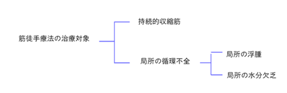 | 筋徒手療法の概要は、以下の通りです。 ・筋徒手療法の治療刺激は ➪ 主に手指による機械的刺激 ・筋徒手療法の治療対象は ➪ “持続的筋収縮筋”と“局所の循環不全” ・筋徒手療法の治療目的は ➪ 治療的生体反応の惹起 ・筋徒手療法の治療目標は ➪ 主訴の軽減、消失 |